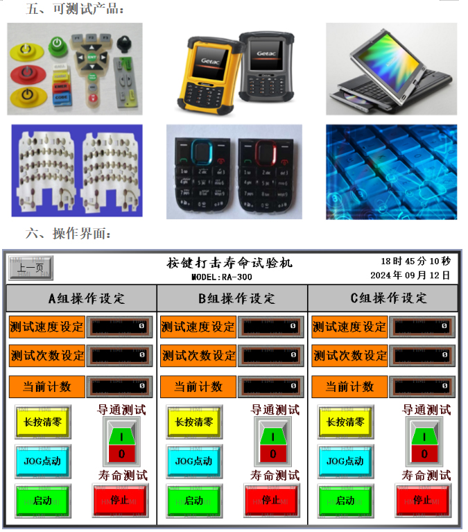同時適用于硅橡膠類按鍵作疲勞測試;具有速度可調(diào),次數(shù)任一設定及同時測試數(shù)個產(chǎn)品(每個產(chǎn)品均可多點測試),到達次數(shù)或掉電停機后保持數(shù)據(jù)。